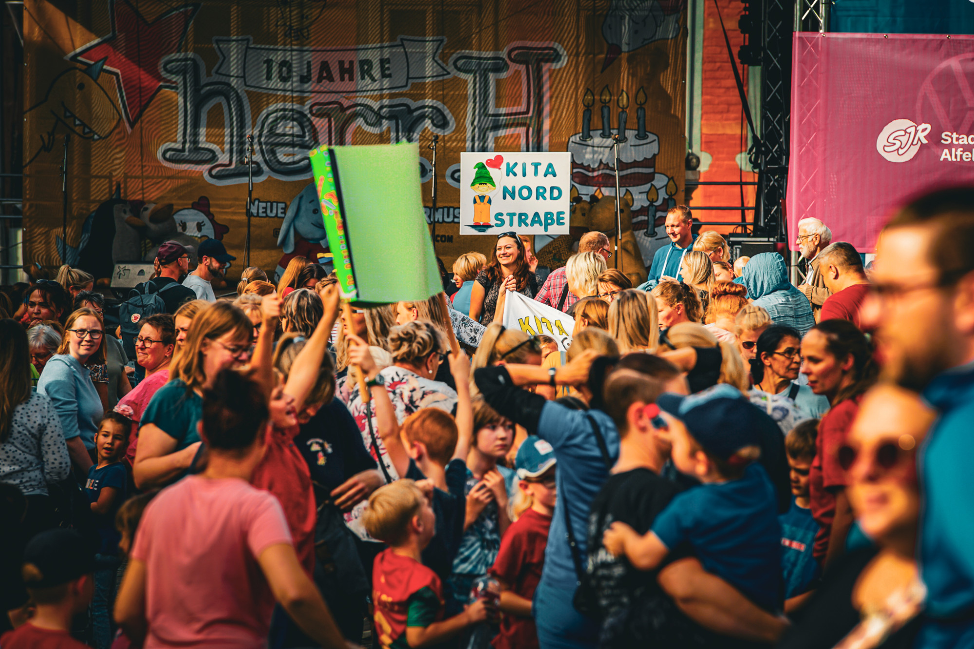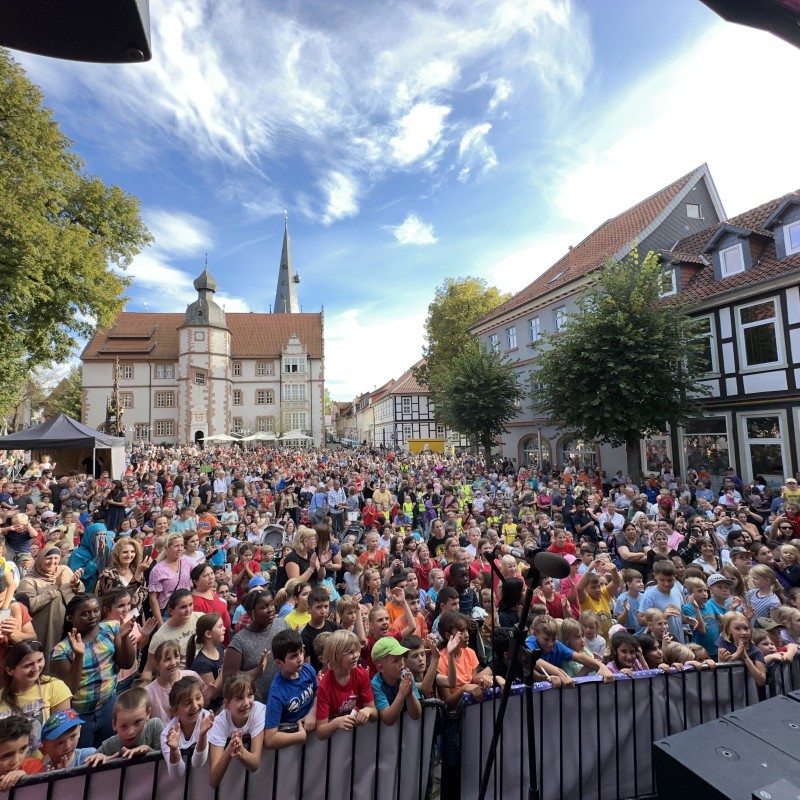 Eine weitere Großveranstaltung war die erneute Veranstaltung zum Weltkindertag auf dem Alfelder Marktplatz mit Herrn H am 20.09.24. Parallel zum Kinderkonzert konnten Eltern sich über verschiedene Beratungs-, Bildungs- und Unterstützungsangebote vor Ort informieren. Jeder Stand hat dazu noch Mitmach-Aktionen für Kinder angbeoten. Es waren etwa 2.000 Besuchende anwesend.